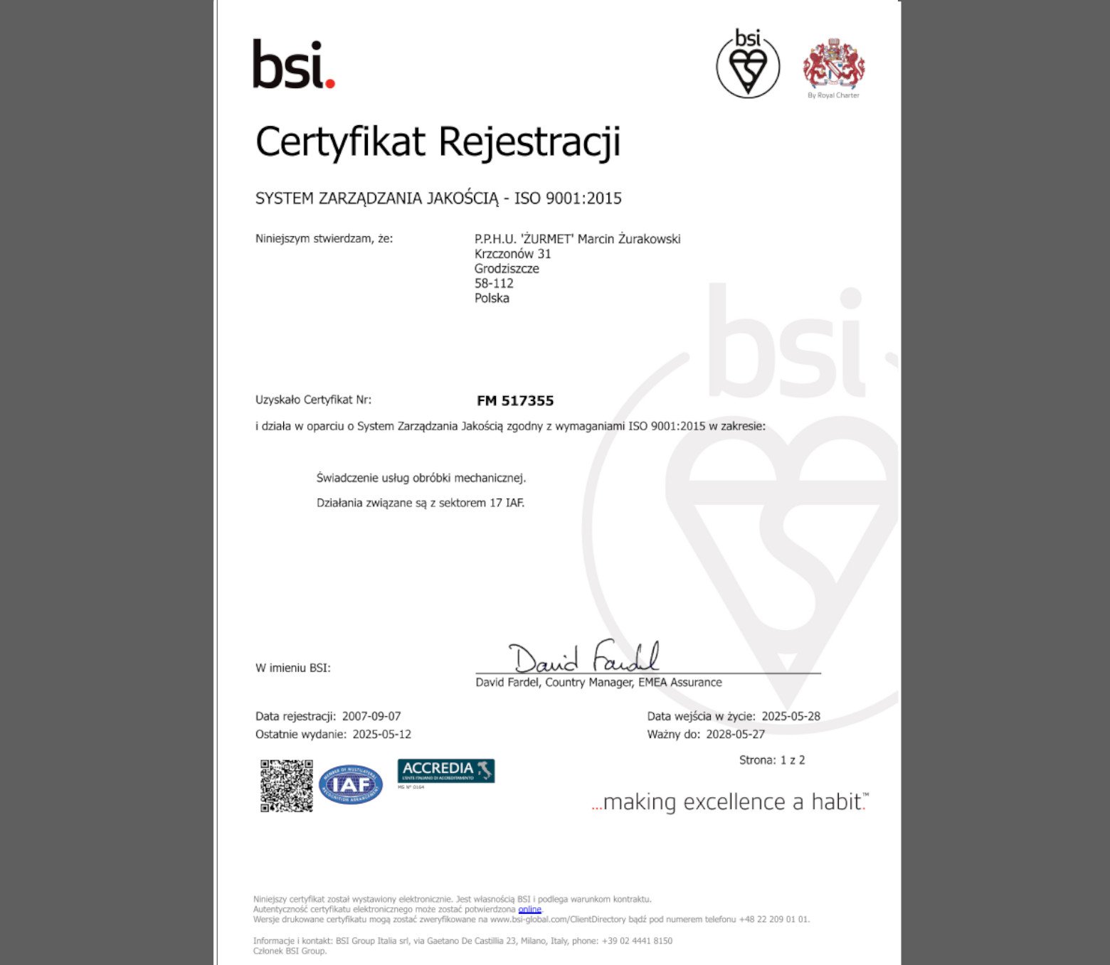 Firma PPHU ŻURMET Marcin Żurakowski posiada certyfikat wdrożenia Systemy Zapewnienia Jakości ISO 9001 nieprzerwanie od 2007 roku. Obecny certyfikat jest zgodny z normą ISO 9001: 2015. Certyfikat można zweryfikować w firmie certyfikującej na stronie www